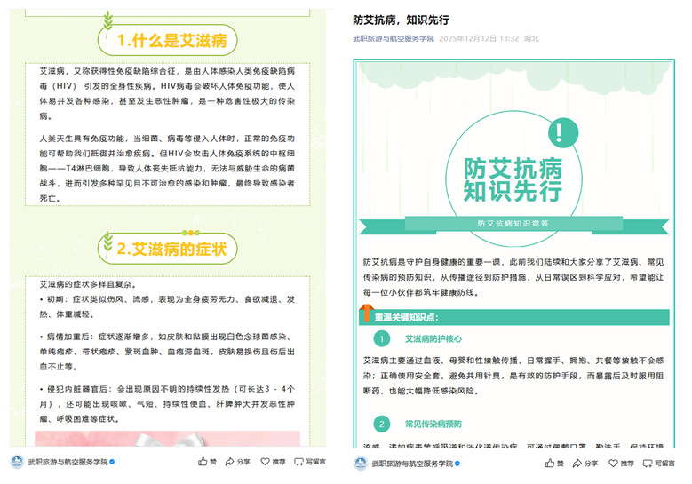 第38个世界艾滋病日来临之际,武汉职业技术大学后勤保障处联合旅游与航空服务学院(以下简称“旅航学院”),于12月1日至12日推出“线上 + 线下”融合防艾系列活动。活动以“知艾防艾、关爱包容”为核心,通过专业讲座、趣味竞答等多元形式,为全校学子筑牢健康防线,强化职业健康意识,让防艾知识真正入脑入心。
