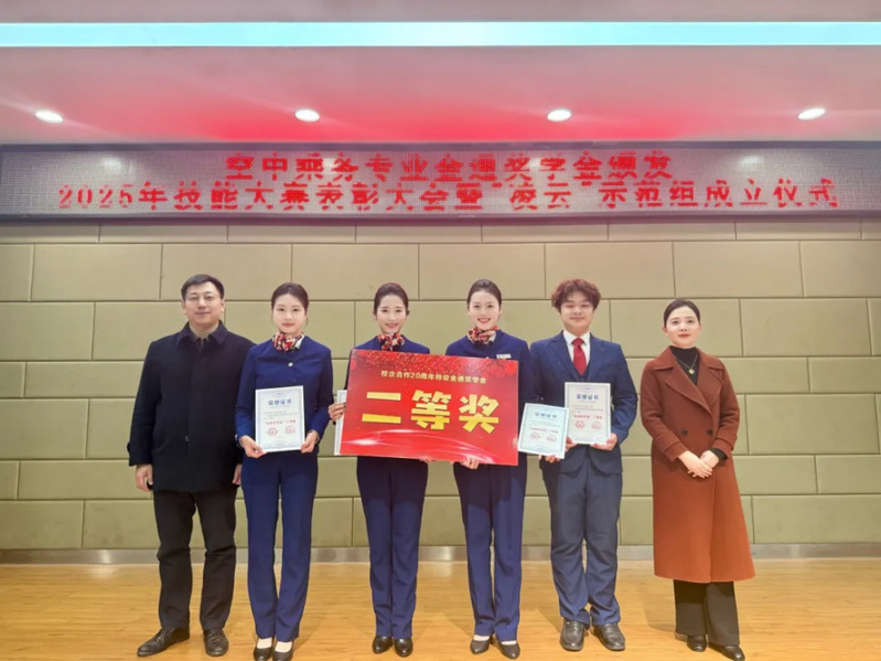 随后,大会对在2025年全国高等学校民航服务技能大赛中创下佳绩的团队予以重奖。武汉职业技术大学空乘代表队38名参赛学子凭借过硬的专业技能、出色的团队协作和昂扬的精神风貌,从全国众多高校中突围,勇夺团体冠军。此外,刘亚文获“最佳人气二等奖”,朱玥颖获评“形象大使”。这些荣誉既是学校教育教学改革成果的缩影,也是武职学子勇于拼搏、追求卓越的生动体现。
