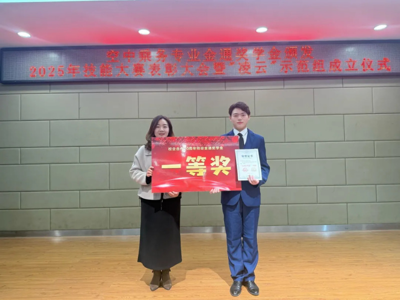 大会核心环节是对优秀学子的集中表彰,展现“以赛促教、以赛促学”的改革成效。大会颁发校企合作二十周年特设的“金通”奖学金。该奖项体系完备,涵盖“旅学”(学业卓越)、“旅技”(技能精湛)、“旅志”(志趣高远)、“旅艺”(才艺突出)、“旅星”(服务新星)五大单项奖及综合奖,鼓励学生全面发展。经严格评审,吴浪、王童林等32名品学兼优的空乘学子脱颖而出。其中,一等奖学金3000 元,二等奖学金2000元,三等奖学金1000元,单项奖学金500元。这套多元评价体系打破唯分数的传统模式,是对学生综合职业素养的立体化认可。