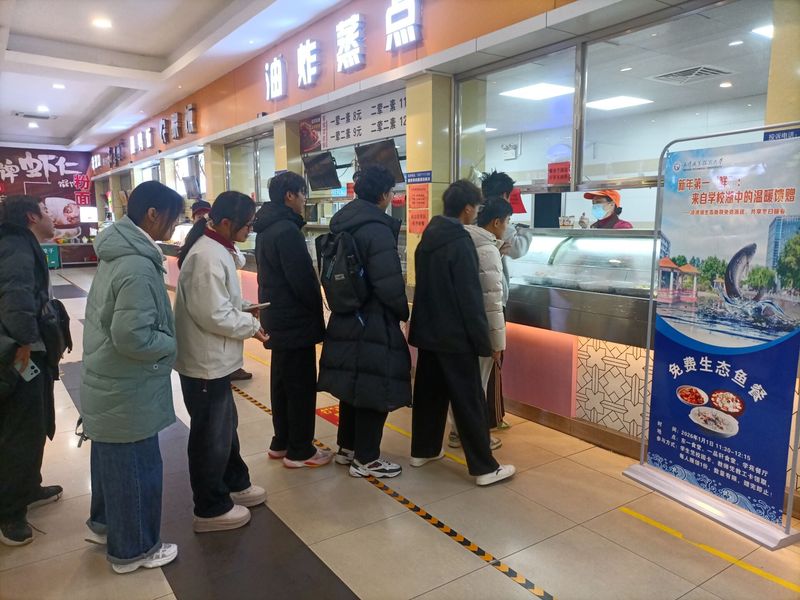 元旦中午,食堂赠鱼窗口前排起了长队,学生凭校园卡、教师凭教工卡有序等候。现场鱼香四溢,笑声不断,节日的快乐值直接拉满!