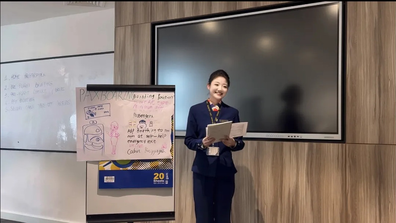 全英文小班制的教学模式,让刘亚文在研修中实现了快速成长。学院的课程遵循国际先进的 OBE(成果导向教育)理念,每一节课都紧扣航空服务核心能力培养,贴合国际航空公司的实际岗位需求。这与全国高等学校民航服务技能大赛“匠心筑梦新时代、精技强能向未来”主题高度契合,也是对大赛所倡导的专业技能培养的延伸与升华,让刘亚文在专业能力上实现了从赛场到国际实训平台的进一步提升。