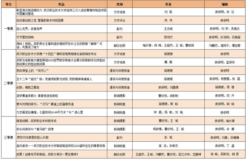 新闻网讯(党委宣传部 罗露)近日,2025年度湖北高校新闻奖评选结果揭晓。武汉职业技术大学18件作品入围榜单,其中,一等奖5项、二等奖8项、三等奖5项,位居湖北高校前列。
