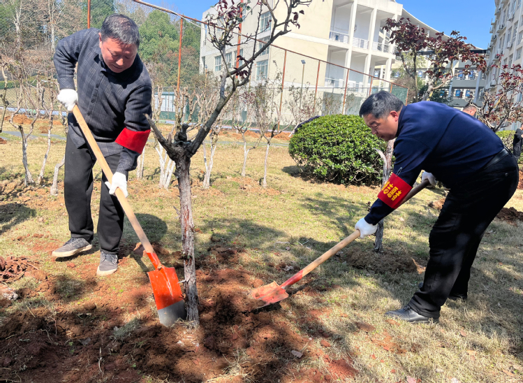 新闻网讯(通讯员 罗芳)2026年“3·12植树节”来临之际,后勤保障处党总支在学校东区篮球场旁开展“植绿护绿,党员先行”主题党日活动,全体党员及入党积极分子踊跃参与。副校长李仁平以普通党员身份加入劳动队伍,与大家一起挥锹添绿,共绘校园生态新图景。