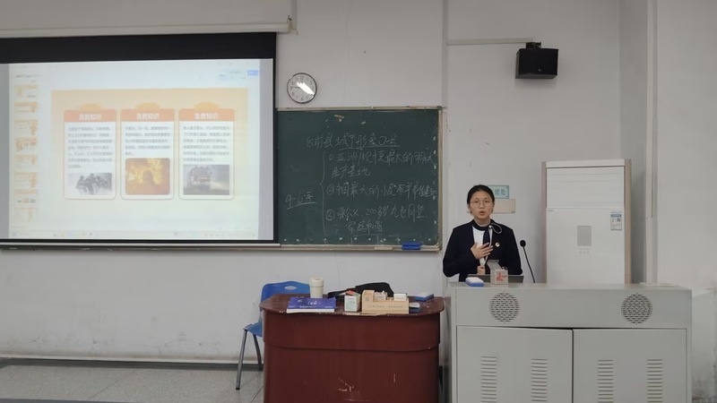 投影上放着真实案例的视频,宣讲人员现场示范湿毛巾捂口鼻等标准逃生动作,细致演示灭火器摇晃、拔栓、对准火源根部的完整操作流程。宣讲过程用通俗语言,全面讲解火灾日常防范要点、火场自救逃生技巧、消防器材规范使用及应急避险相关知识,内容详实且实用、贴近校园生活。青年学生从被教育者变为传播者,在守护身边师生安全的实践中,夯实奉献担当的青春根基。