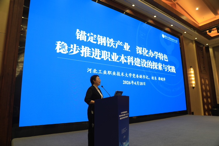 河北工业职业技术大学校长薛晓萍以《锚定钢铁产业、深化办学特色,稳步推进职业本科建设的探索与实践》为题,围绕职业本科关键办学能力提升,聚焦专业布局优化、深化产教协同育人、强化职业素养培育,着力培养“下得去、用得上、留得住”的高层次技术技能人才。