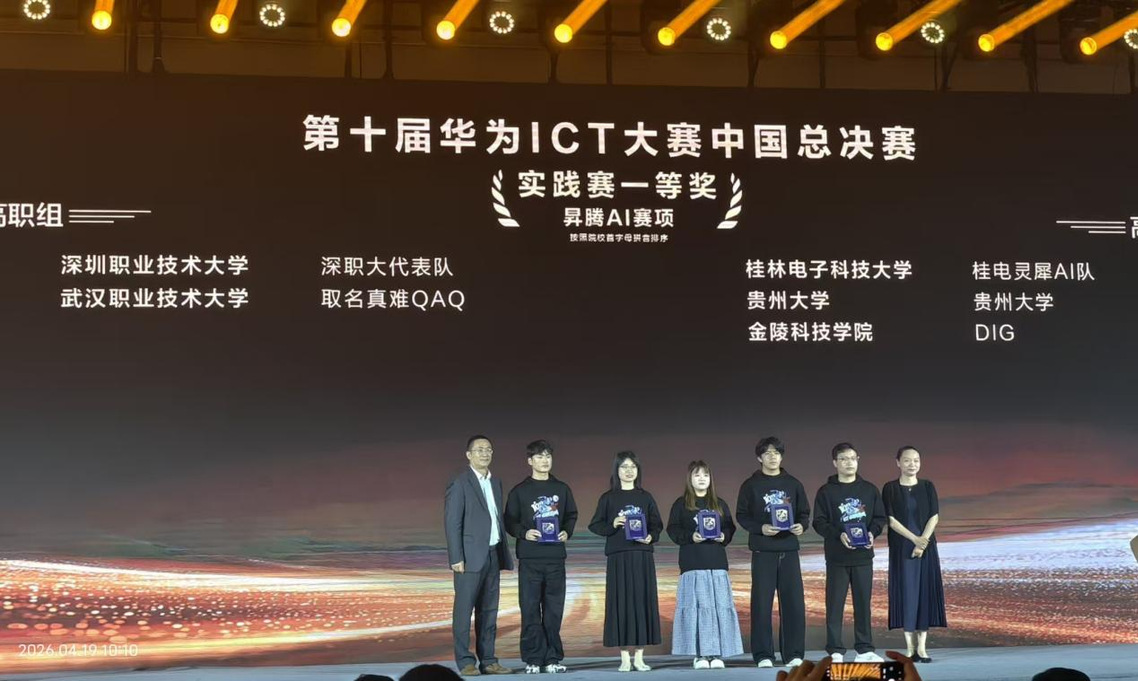 新闻网讯(通讯员 肖渝琪)4月19日,第十届华为ICT大赛中国区总决赛圆满落幕。武汉职业技术大学人工智能学院(信创产业学院)师生在大赛中表现优异,荣获全国一等奖 2项、二等奖2 项,实现师资教学能力与人才培养质量双丰收。